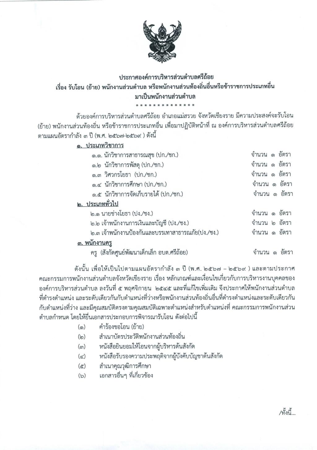 ประกาศรับโอน(ย้าย)พนักงานส่วนตำบลหรือพนักงานส่วนท้องถิ่นอื่นหรือข้าราชการประเภทอื่นมาเป็นพนักส่วนตำบล...