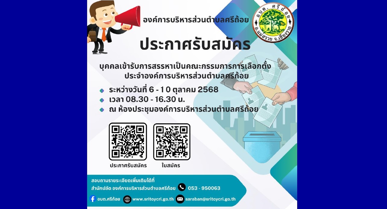 | 6 | (ประกาศรายชื่อผู้ชนะการเสนอราคา / ประกาศผู้ได้รับการคัดเลือก) ซื้อวัสดุไฟฟ้าและวิทยุ จำนวน ๑ รายการ (สำนักปลัด) องค์การบริหารส่วนตำบลศรีถ้อย อำเภอแม่สรวย จังหวัดเชียงราย โดยวิธีเฉพาะเจาะจง | คลิกอ่าน.. | 28/10/2568 |
